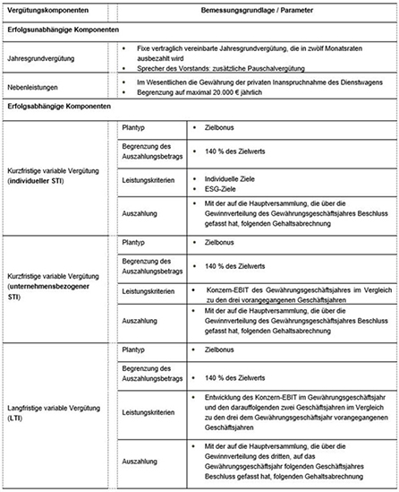 Beschlussfassung über die Billigung des Vergütungssystems für die Vorstandsmitglieder Gemäß § 120a Abs. 1 AktG beschließt die Hauptversammlung über die Billigung des vom Aufsichtsrat vorgelegten Vergütungssystems für die Vorstandsmitglieder bei jeder wesentlichen Änderung des Vergütungssystems, mindestens jedoch alle vier Jahre. Der Aufsichtsrat schlägt vor, das nachfolgend wiedergegebene, vom Aufsichtsrat mit Wirkung ab dem 1. Januar 2021 beschlossene Vergütungssystem für die Vorstandsmitglieder zu billigen. Vergütungssystem für die Vorstandsmitglieder der Südwestdeutsche Salzwerke AG